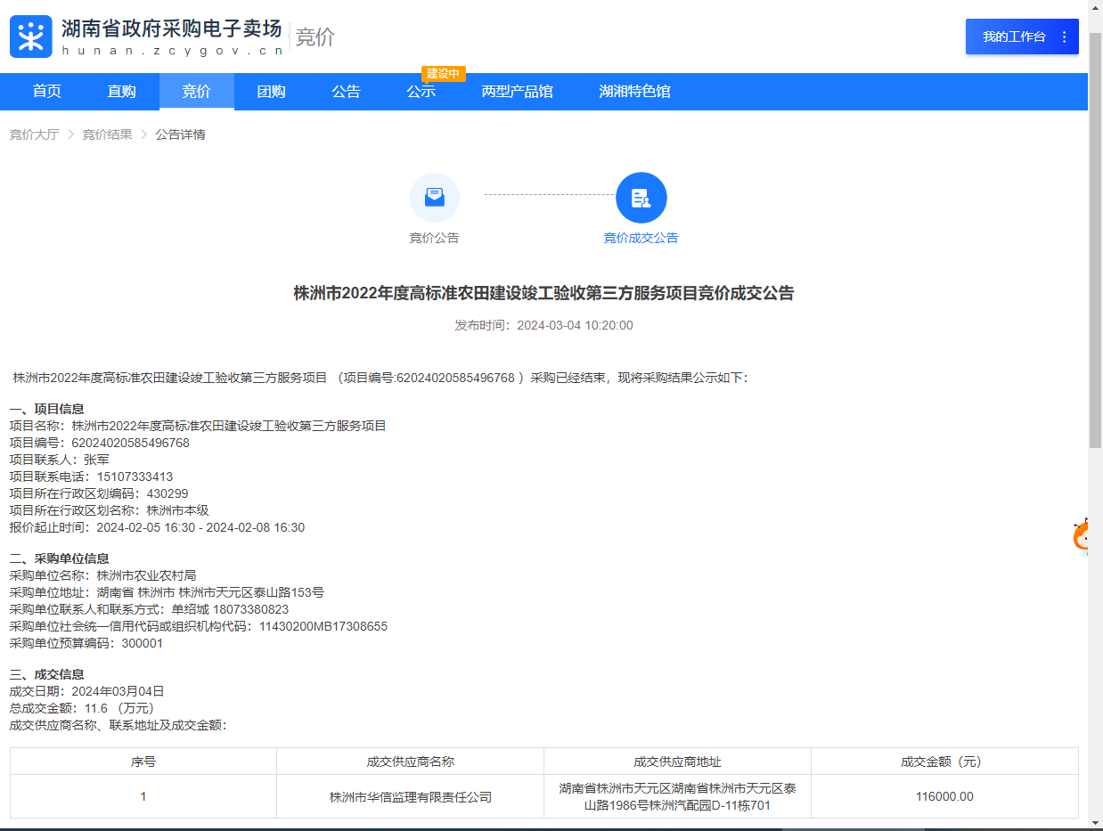 2024年3月4日,“湖南省政府采購電子賣場”發(fā)布《株洲市2022年度高標(biāo)準(zhǔn)農(nóng)田建設(shè)竣工驗(yàn)收第三方服務(wù)項(xiàng)目競價(jià)成交公告》,顯示株洲市華信監(jiān)理有限責(zé)任公司成為本項(xiàng)目成交供應(yīng)商。這意味著,我公司喜迎龍年“開門紅”。